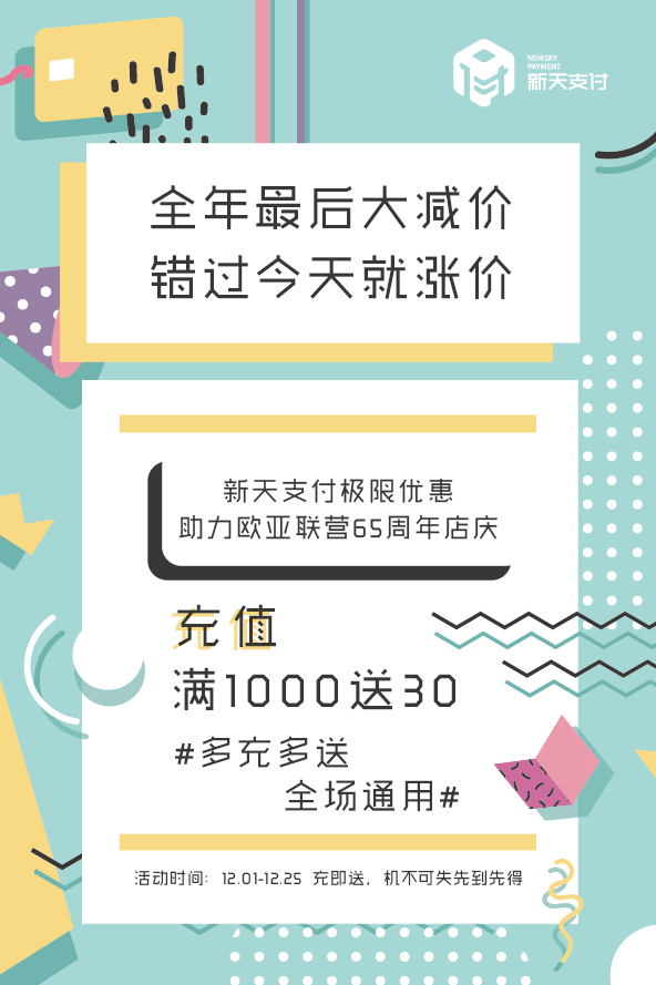 新天支付助力歐亞聯(lián)營(yíng)店慶活動(dòng),全場(chǎng)消費(fèi),多購(gòu)多送!